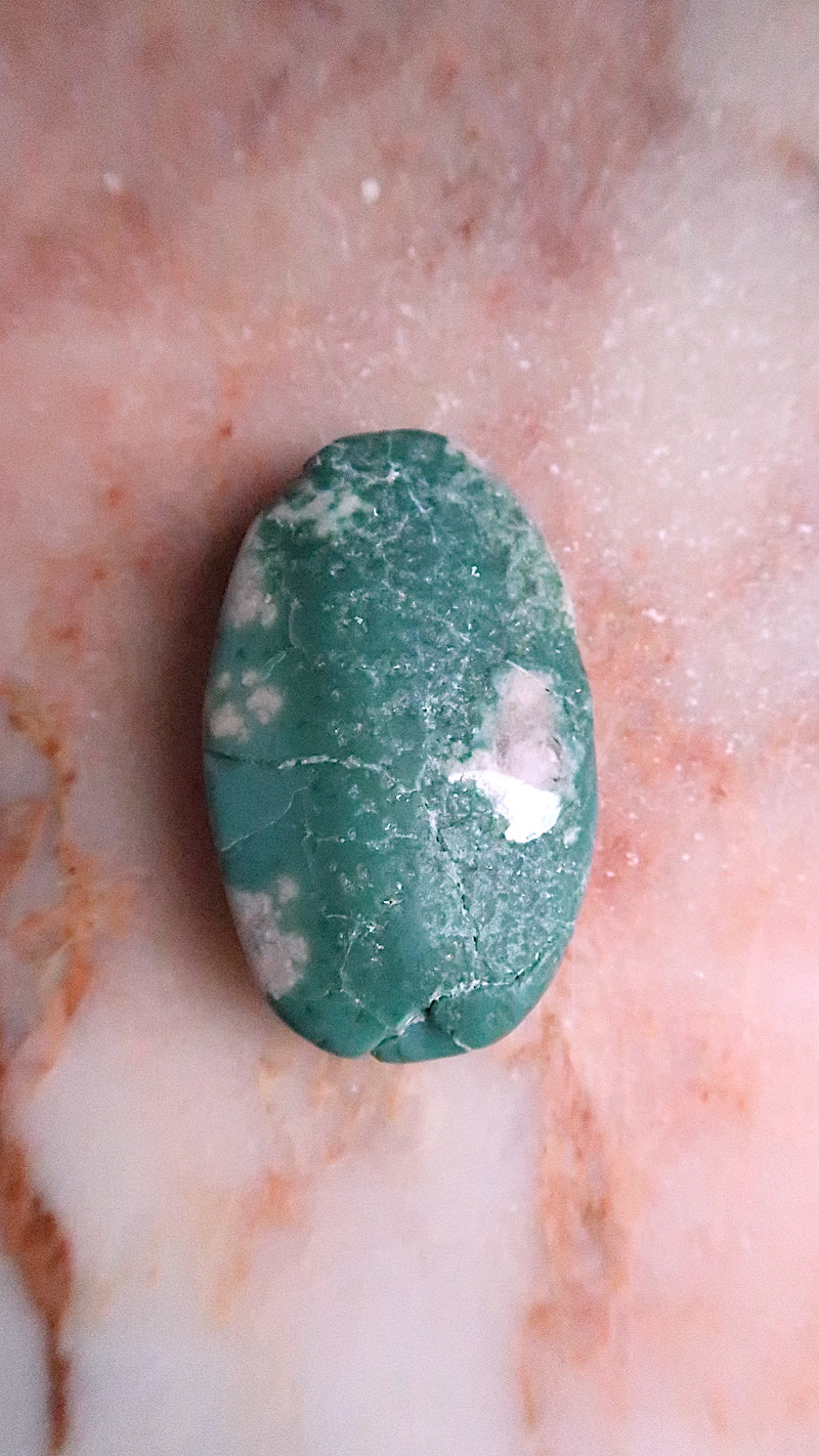 A stunning Agate palm stone with tones of soft pink and turquoise. The pattern within the crystal resemble flowers. Part raw/ part polished.
