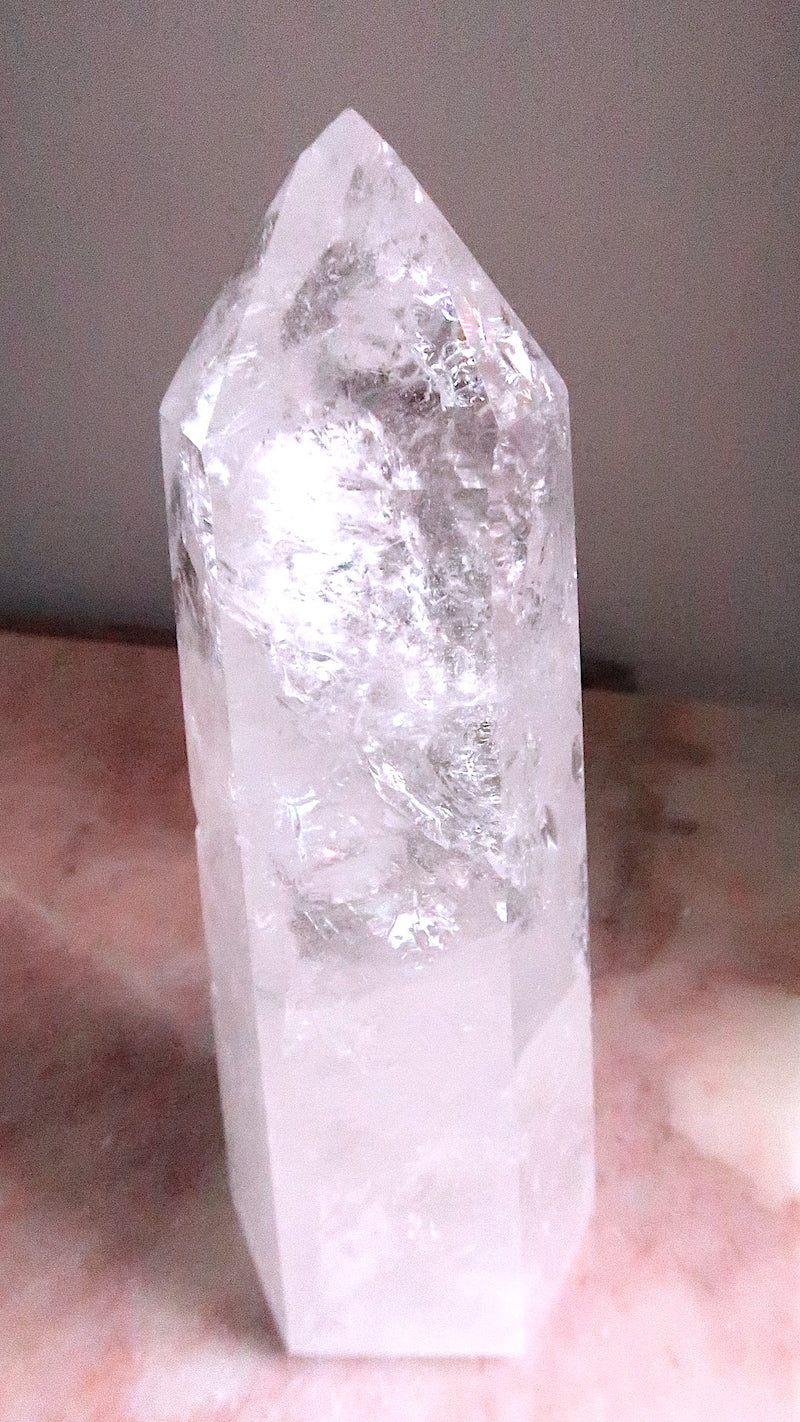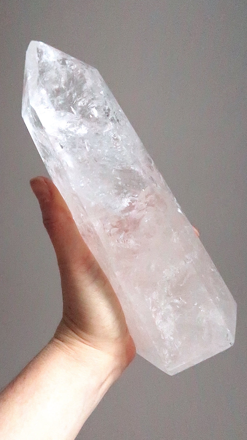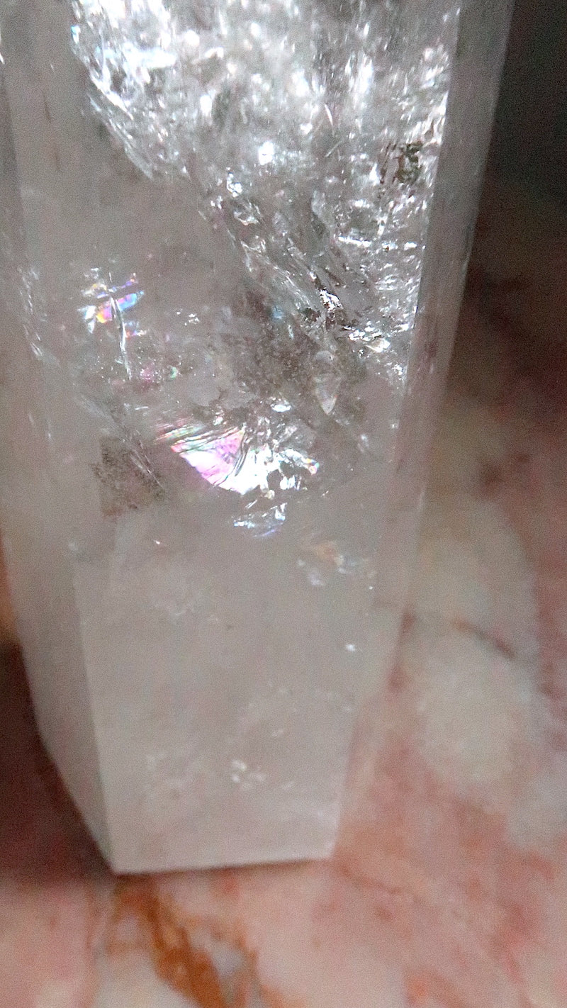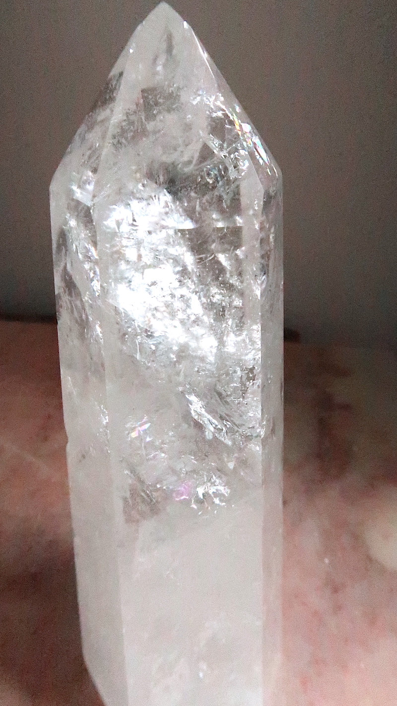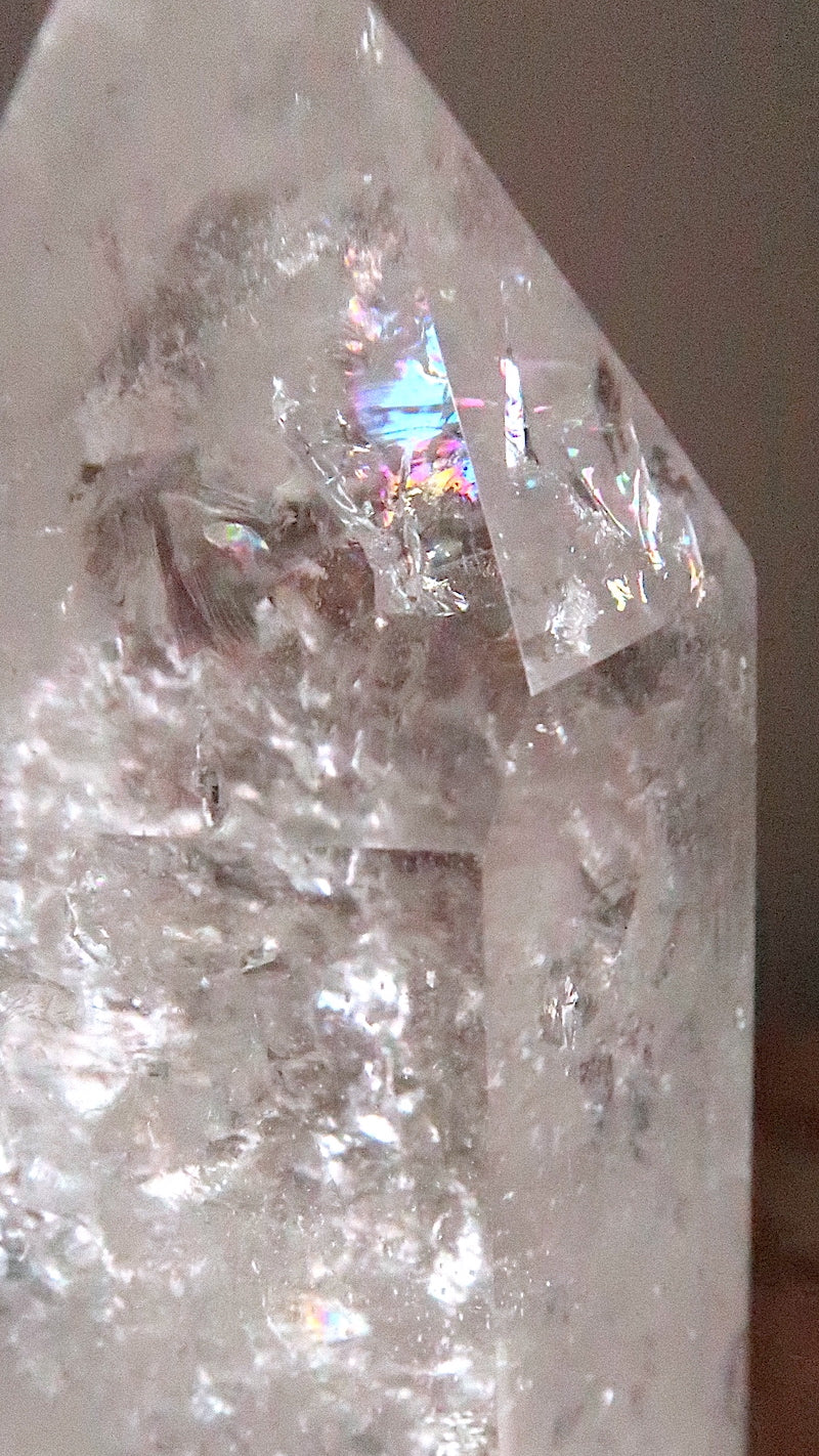 Extra large Clear Quartz point filled with rainbows. Amazing clarity. Premium grade. Part polished/part raw. This is a high polished piece however there may be some areas with varying levels of polishing.