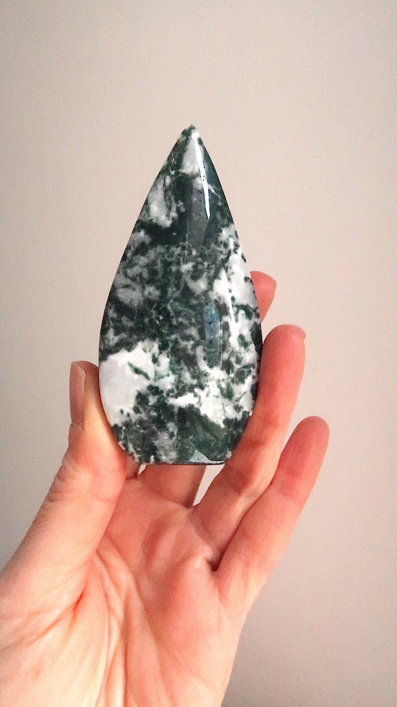 Moss Agate helps to bring balance to our life. It helps us connect to the grounding energies of Gaia and bring peace and stability. This is a wonderful crystal to help stimulate creativity and awaken us to the abundance of the nature beauty that is all around us.