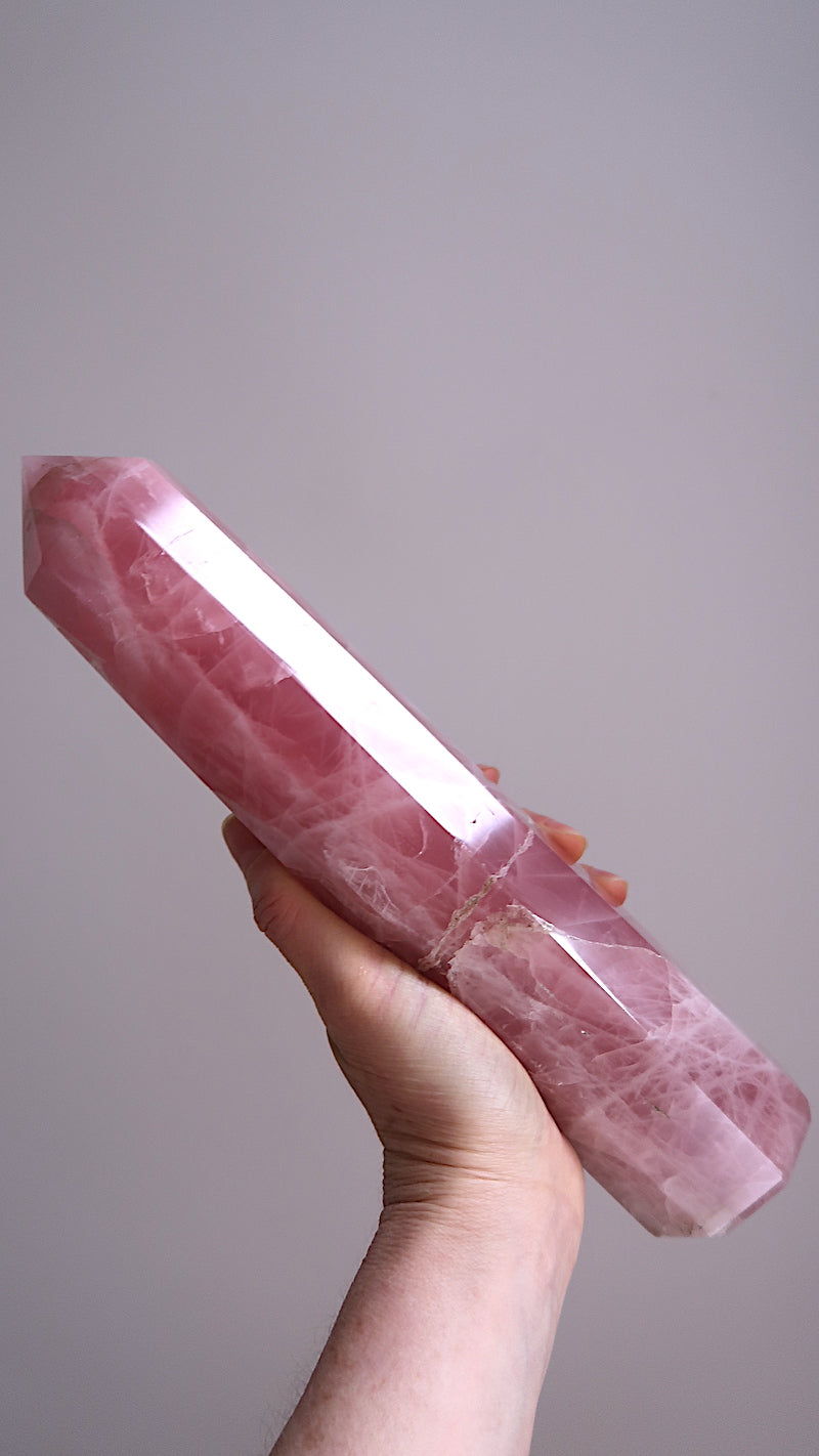 A stunning, extra tall Rose Quartz point with deep and pastel pink tones.