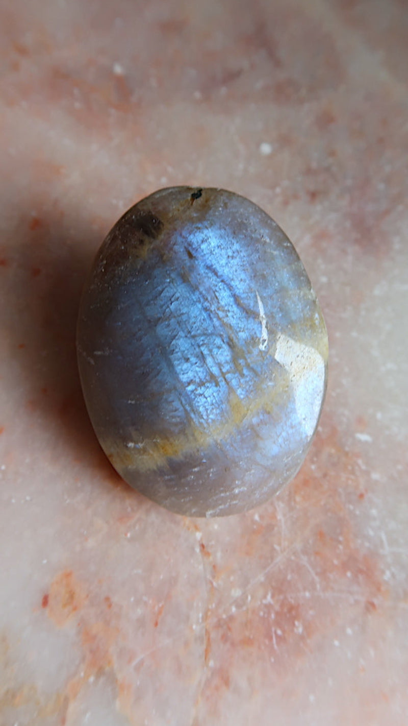 A beautiful Black Moonstone palm stone with flashy blue tones.